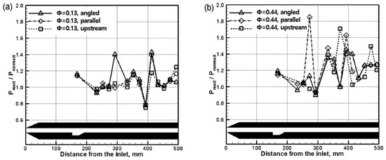In the region from the cavity’s trailing edge to x = 293 mm, the pressure ratios were almost unity. Downstream of x = 293 mm, pressure ratios increased about 15% on average for Φ = 0.13. This result came from the oblique shock generated by the cavity’s trailing edge, leading to a rise in temperature and enhanced fuel–air mixing, which leads to combustion heat release. In Figure 7b, pressure ratios in the cavity at high equivalence ratio had similar values to those at low equivalence ratio. Therefore, the difference in equivalence ratio was not closely correlated with the pressure increase in the cavity caused by combustion. At high equivalence ratio, pressure ratios downstream of the cavity were greater than unity. In particular, there was an average 30% pressure increase rate downstream of x = 293 mm. Regardless of the equivalence ratio, the pressure ratio increased gradually as it approached the end of the combustor.