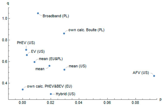 Considering that a selection of Bass model parameters with limited data usually cause market value underestimation, another method of the estimation was adopted, namely forecasting by analogy (FBA). According to this approach, the most suitable model in this class would be the Bass model. It could be explained by the fact that the Bass model is a diffusion model with the most well-grounded interpretation. Moreover, the imitation and innovation parameters have a broader meaning in the context of Rogers interpretation. The estimation of the Bass model parameters for various technologies seems to be more common in the literature compared to the other representatives of this class (i.e., Gompertz or logistics models). In the absence of enough data for Poland, p and q parameters were selected based on carefully reviewed literature.