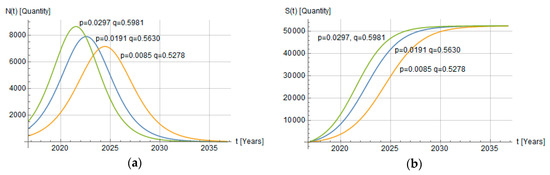 The area where diffusion occurs was taken into consideration. To specify the value of imitation and adoption parameters for Polish users, data from other technologies adopted in the country have been used. The work [47] provides estimated parameters for Poland p = 0.0109 and q = 1.0497 (broadband internet technology). Similarly, in the work [50] parameters for ICT (information and communication technology) were estimated—p = 0.0013, q = 0.503, indicating a relatively low level of innovation coefficient and a relatively high imitation index q for Poland (world average for q = 0.38 [51]). The work [52] demonstrates that Poland has the highest imitation index compared to the neighbouring countries owing to a very specific Polish market; it is also worth noting that parameter q > 1 is not treated as an inadequate value for the model, and can be interpreted as an additional impact on the desire to duplicate technology. In addition, the innovation and imitation coefficients for Poland were calculated using the algorithm presented by [53], where p = 0.0293 and q = 0.863 (Appendix B).