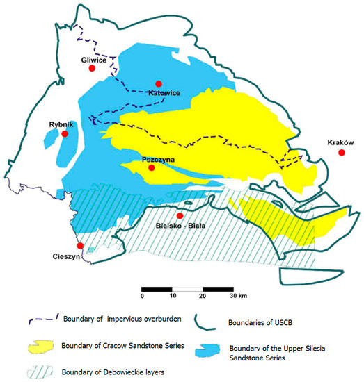 The geological characteristics of the site and its overburden were developed on the basis of the available geological documentation and analyses of the Dębowiec layers, as well as on the basis of previous work on the possibility of injecting salt mine waters into the rock mass in the Upper Silesia region [24]. In Figure 1, the area of the occurrence of the Dębowiec layers is presented [25]. Hydrogeological data were developed based on the results of hydrogeological investigations, which were conducted in this region at different times. The data included in total the results of the research in 67 holes; mostly, these were the results from the direct field tests and, less frequently, from laboratory tests. The geological survey was mainly carried out by means of boreholes, as well as seismic tests. Drilling holes were characterized by varying degrees of information reliability, along with full holes drilled behind coal; there was also a significant number of coreless oil holes. Two zones are clearly visible, namely the better recognized one within the limits of the Upper Silesian Coal Basin, especially in the vicinity of mines, and the very poorly recognized one within the limits of the southern embankment of the basin. In order to characterize the geological conditions of the layers for CO2 storage, as well as the formation constituting the reservoir insulation, the following four litho-stratigraphic units of the Miocene molasses were isolated [26]: the Zebrzydowice, Dębowiec, Zamarski, and Skawina formations, respectively.