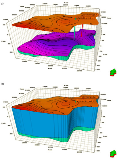 Modelling the flow of CO2 in the geological structure may be reduced to the following basic issues that are necessary to analyze: (a) thermal and hydrological, (b) geo-mechanical, (c) chemical, and (d) biological processes [28]. The three-dimensional conceptual and static geological model described the analyzed complex in terms of geological structure of the physical trap, geo-mechanical, geo-chemical, and flow properties of the reservoir overburden (cap-rock, seals, porous, and permeable horizons) and the surrounding formations. In addition, the model also considered fracture system characterization and the presence of any human made pathways, the areal and vertical extent of the storage complex, as well as the pore space volume (including porosity distribution) and baseline fluid distribution, respectively [29].