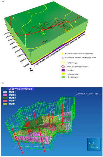 The conceptual model of the Bielsko reservoir was developed on the basis of geological data from 73 geological profiles. In the model, simplifications were made based on the presentation of overburden layers consisting of the Skawina formations and the Carpathians over-thrust in the form of a single layer. This simplification was introduced after a thorough analysis of the geological, hydrogeological, and petrographic properties of these formations (see Figure 2). This simplification did not affect in any way the results of further research and simulations of the CO2 spread in the site.