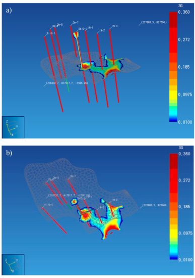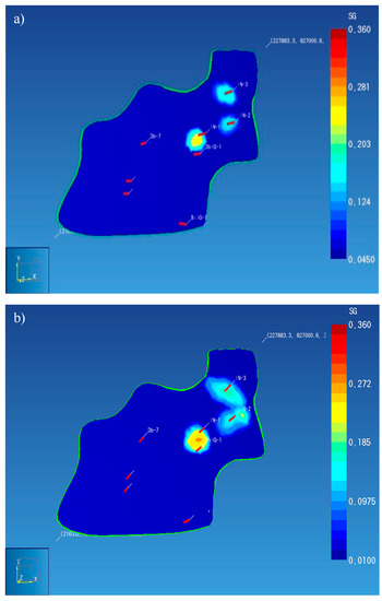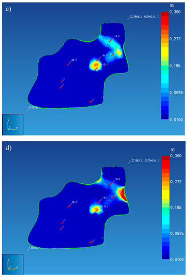 The results of numerical modelling presenting the gas saturation in the roof of Dębowiec layers after the elapsing of: (a) 25, (b) 55, (c) 80, and (d) 150 years.