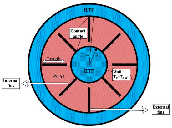 One of the most important weaknesses of PCMs is their low thermal conductivity that affects their function in energy storage devices in terms of rate of thermal charging and discharging. As extensively studied before [14,15,16,17,18,19,20,21,22], application of extended surfaces such as fins is one of the methods that can address this problem. The thermal conductivity of metal fins is far higher than PCMs that help increase the heat transfer rate between the heat transfer fluid (HTF) and the PCM. This results in enhancing the overall performance of the LHTES systems in terms of rate of thermal charging and discharging [10]. Applying fins is also an economical option due to being easy to fabricate [6]. Different key characteristics of these fins such as thermal conductivity, geometry and configuration, material (e.g., being corrosion resistance), and cost must be considered when designing them for performance enhancement of PCMs. [8].