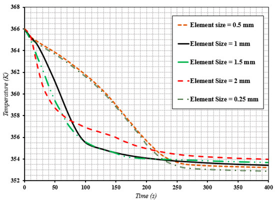 In addition, to ensure the independency of the acquired outcomes from the element size and mesh topology, a mesh independency investigation was conducted by comparing the average temperature of whole PCM area for five grid arrangements with specific element sizes of 0.25, 0.5, 1.0, 1.5, and 2.0 mm and the total number of cells = 365,600, 94,940, 24,072, 10,920, and 6136 respectively. The results obtained from the mesh independency study showed that the element size of 0.5 mm was reliable, whereas by using smaller size of cells almost similar results were obtained that did not justify using them, i.e., considering the significant increase in the computational time with higher number of elements. The outcomes of this mesh independency study are presented in Figure 2.