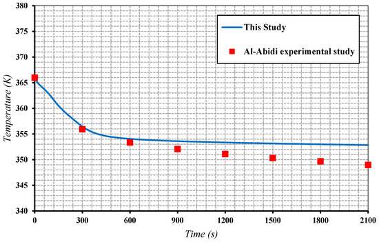 Comparison of the temperatures obtained from the CFD simulation (this study) with the experimentally values reported by Al-Abidi et al. [33].