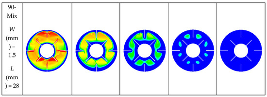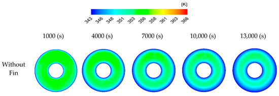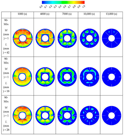 In order to investigate the impact of the fins’ dimensions on the solidification enhancement, four different dimensions for the system with 90° fins were considered (1 mm × 42 mm, 1.5 mm × 28 mm, 1 mm × 28 mm, and 1 mm × 18 mm). The results (i.e., temperature and liquid fraction contours) were presented in Figure 6 and Figure 7, respectively for 1000–13,000 s with a maximum time interval of 3000 s. It is worth mentioning that the width increase had a negative influence on the performance of the system in terms of solidification enhancement. On the other hand, the length of the fins had a positive effect on reducing the solidification time, since thermal penetration depth is enhanced by using longer fins. Increasing the fins length from 18 mm to 28 mm improved the performance of the TES system to a certain level (i.e., 28 mm) However, by further increasing this length from 28 mm to 42 mm, the performance of the system was adversely impacted. It can be concluded that the fin’s length has an optimal value to minimize the time required for complete solidification.