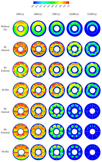 Figure 5 illustrates the liquid fraction contour for different case studies with various fin configurations using fins with similar dimensions. The PCM solidification enhancement can be compared by referring to the time required for solidification. The area of the molten PCM becomes smaller up to the point that the PCM solidifies completely. Overall, at the first stages of the solidification process, the liquid PCM is in direct contact with the cold surfaces of the internal and external tubes and a thin layer of the solidified PCM is formed on the surface of the cold tubes that becomes thicker over time. Thicker solid layer induces a bigger thermal resistance and the solidification abates temporally.