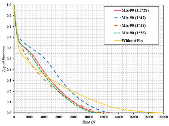 The average liquid fraction during the time for the PCM area with different fins’ dimensions.