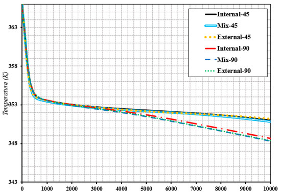 The trends of reduction in average temperature and liquid fraction in the area filled with PCM are provided in Figure 8, Figure 9, Figure 10 and Figure 11. Moreover, in Figure 8 and Figure 9 the time of complete solidification (liquid fraction equals to 0) can be seen and compared. The results demonstrate that the complete solidification achieved easier using fins with the width of 1 mm and length of 28 mm. Furthermore, the angle of 90° was found to be more effective for attachment of metallic fins. Moreover, fins on both internal and external tubes of the TES system was more beneficial compared to the cases with fins on just one tube. The higher average temperature reveals that the solidification happens later. This is evident by comparing various case studies near the end-point of solidification. The exact required time for complete solidification and the time reduction percentage were given in Table 3 for easier comparison.