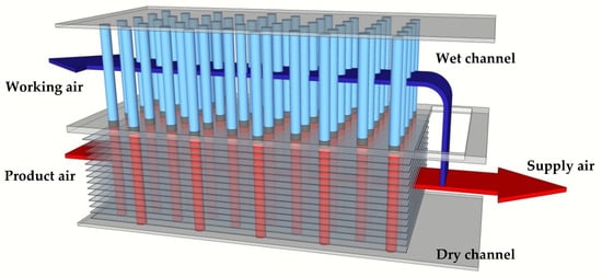 During operation, the product air flows along the dry channel, transferring its sensible heat to the wet channel. As a result, the product air temperature decreases without a humidity ratio change. Then, part of the air is branched from the product air and flows in countercurrent arrangement along the wet channel. The working air absorbs sensible heat from the product air in the dry channel. The gathered heat in the GAHP condenser is removed due to the water evaporation from the condenser external surface. In this context, the wet channel should be made of specially designed materials with high water retention and wick ability, which allow for an even water distribution around the condensation section of GAHPs. For this purpose, a porous plastic layer was implemented. Finally, the moist working air is rejected from the cooler, while the supply air can be provided to the conditioned room.