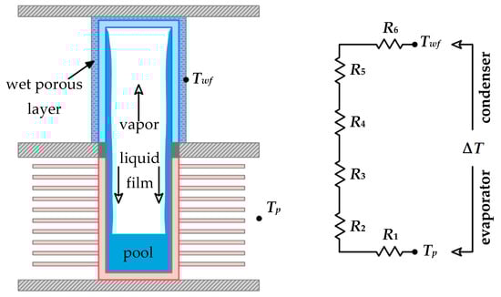 The overall heat transfer coefficient between the product airflow in the dry channel and the wet porous layer in the wet channel can be expressed by Equation (7). This equation was derived from thermal resistances that were connected in series between the product airflow and the water film on the surface of the porous layer. The thermal resistances of liquid–vapor interfaces and axial conduction resistance through GAHPs were neglected. Therefore, the overall heat transfer resistance consists of six components, i.e., R1, R2, R3, R4, R5, and R6. The thermal resistance R1 is related to the interface between the product air in the dry channel and the finned GAHP wall. Additionally, the thermal resistances related to the evaporator include the radial conduction (R2) and the evaporation of the working fluid (R3). The thermal resistances R4, R5, and R6 are related to the condenser section and stand for the condensation of the working fluid, the radial conduction in the GAHP wall, and the radial conduction through the wet porous layer, respectively.