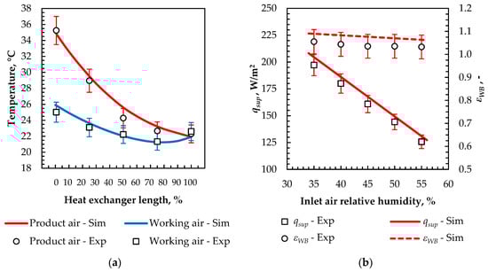 Alharbi et al. [33] carried out an experimental study on an integrated heat pipe and porous ceramic cuboid-based indirect evaporative cooler (IEC2). The experimental data were employed to perform the second validation by a comparison with the simulation results. The measurement data and simulation results were presented in Figure 6. The simulated air temperature distribution inside of IEC2 follows the measurement points, although some insignificant discrepancy can be observed (Figure 6a). The largest error in terms of the product air temperature drop is 1.3 °C, and the corresponding discrepancy is 5.2%. Figure 6b compares the simulation results with the experimental data and presents the cooling capacity and wet bulb effectiveness under variable inlet air relative humidity. The deviation of the obtained results within 5% indicates that the model is able to evaluate the cooling performance precisely. However, it can be observed that the calculated performance indicators of the IEC2 were overestimated. It is due to the mathematical model assumptions, i.e., uniform air and water distribution, and no heat exchange with surroundings.