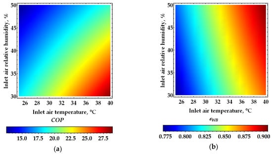 Contour plot of impact of inlet air temperature and relative humidity: (a) Coefficient of performance (COP) coefficient; (b) Wet bulb effectiveness.