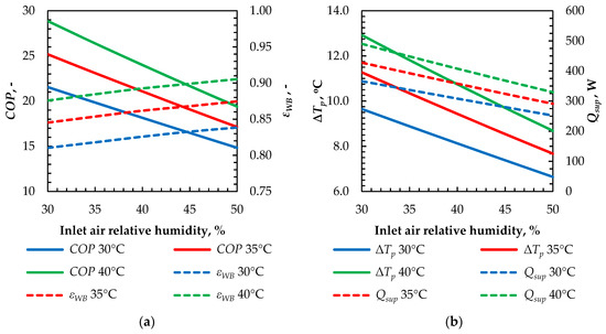 Impact of inlet air relative humidity for constant inlet air temperatures: (a) COP coefficient and wet bulb effectiveness; (b) Product air temperature difference and supply cooling capacity.