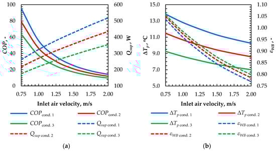 Impact of inlet air velocity: (a) COP coefficient and supply cooling capacity; (b) Product air temperature difference and wet bulb effectiveness.