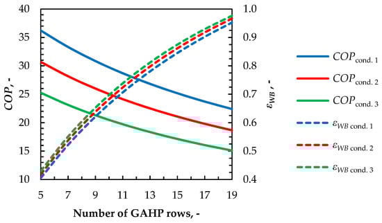 The influence of a number of GAHP rows was investigated. Simulation results were obtained by varying the number of GAHP rows between 5 and 19, while setting the other operating parameters according to Table 6 and Table 7. The cooling performance of the GAHP-based IEC was evaluated by the COP coefficient and the wet bulb effectiveness.