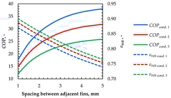 Figure 11 shows the simulation results for the cooling effectiveness parameters under different spacing parameters between adjacent fins. The COP coefficient is largely affected by fin spacing. This is because an increasing pressure drop with an increase of the fin density is observed. It can be seen that the COP achieves maximum values at a fin spacing of 5 mm and increases from the initial value of 17.7 to 38 (Condition 1). Moreover, the wet bulb effectiveness decreases from 0.87 to 0.74 (Condition 1) when the considered fin spacing rises from 1 mm to 5 mm. Thus, the wet bulb effectiveness may be higher when the fins spacing decreases. The reason is that the heat transfer surface increases as the fin spacing decreases. As a consequence, more sensible heat can be transferred by GAHPs from the dry channel to the wet channel. It should be noted that the optimal fin spacing results from the issues of energy savings and fan power consumption. A compromise among the COP coefficient and wet bulb effectiveness suggests that the fin spacing should range from 1.5 mm to 3 mm.