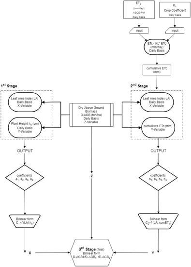 A new empirical equation for the estimation of daily dry above ground biomass (D-AGB) for a hybrid of soybean (Glycine max L.) is proposed. This equation requires data for three crop dependent parameters; leaf area index, plant height, and cumulative crop evapotranspiration. Bilinear surface regression analysis was used in order to estimate the factors entering in the empirical model. For the calibration of the proposed model, data yielded from a well-watered soybean crop for the year 2015, in the experimental field (0.1 ha) of the agricultural University of Athens, were used as a reference. Verification of the validity of the model was obtained by using data from a 2014 cultivation period for well-watered soybean cultivation (100% of crop evapotranspiration water treatment), as well as data from three irrigation treatments (75%, 50%, 25% of crop evapotranspiration) for two cultivation periods (2014–2015). The proposed method for the estimation of D-AGB may be proven as a useful tool for estimations without using destructive sampling.