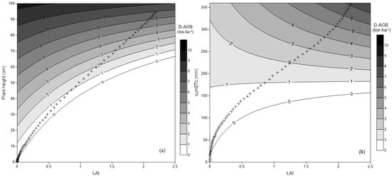 In Figure 2a, the iso-lines of () derived from Equation (1) as a function of , plant height (), and measurements, through curve interpolation lines, respectively, on a daily basis, are presented. Similarly, Figure 2b shows the results of the second stage = f(,). Higher sensitivity showed the - correlation rather than the one of - for the factor.