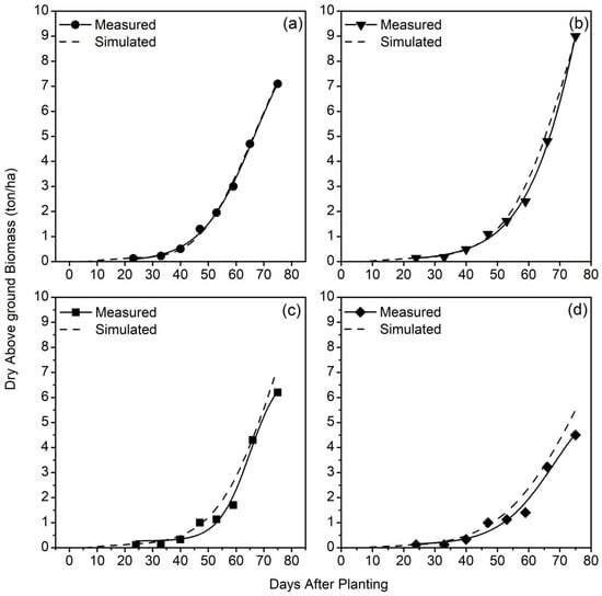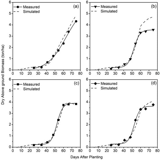 In Figure 4, the development of both measured and simulated curve interpolated lines during cultivation period 2014 expressed in days after planting (DAP), are presented. For the 2014 cultivation period, all four figures (Figure 4a–d)were used for verification purposes. Figure 4a–d depicts the 100%, 75%, 50%, and 25% treatments, respectively. From Figure 4a at 100% treatment, it can be assumed that measured and simulated curve interpolated lines were very close, and at DAP 75 the model predicted 4.951 ton/ha, while experimental for the DAP 75 for the non-water stressed soybean was 4.385 ton/ha. Similarly, the 75%, 50%, and 25% water treatments were perfect fitted until 55 DAP, approximately, for the 2014 cultivation period. However, the response of the plant to the water stress mechanism is a fairly complex process involving both biophysical and biochemical functions that could differentiate predictions of the experimental observations. This induces the differences after DAP 55 for the water stressed treatments in 2014 cultivation period (Figure 4b–d) and for the 2015 water stressed treatments (Figure 3b–d).