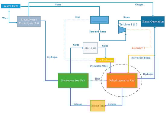 The methylcyclohexane (MCH-4) is fed to the dehydrogenation reactor (DeH-Reactor), where methylcyclohexane dehydrogenation to toluene and hydrogen is carried out using a suitable catalyst. The hydrogen addition is also done with the feed (after compression) to increase the catalyst stability and activity. Initially, the electrolysis section provides the hydrogen for the plant startup. Toluene and hydrogen production take place in the dehydrogenation reactor, which are separated using a separator. The separated hydrogen is fed/recycled to the dehydrogenation reactor (with methylcyclohexane) replacing hydrogen from the electrolysis section. The products of dehydrogenation reactor (DeH-1), after exchanging heat to methylcyclohexane (MCH-3) in the superheater (DeH-2), are sent to the separator for separation of hydrogen and other products. Part of the hydrogen is recycled, while part of the hydrogen is used to generate superheated steam (by reaction with oxygen in the steam generator). The superheated steam drives the steam turbine and the saturated steam (Steam) is used for pre-heating and vaporizing of the feed. The outlet steam (Steam-2) from the vaporizer is used in the different industrial processes.