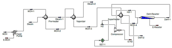 Aspen HYSYS v. 9.0 was used to carry out the simulation of the overall system. The complete schematic of the system is presented in Figure 1, out of which the dehydrogenation system has been taken for this study. The remaining system has been studied previously [33].