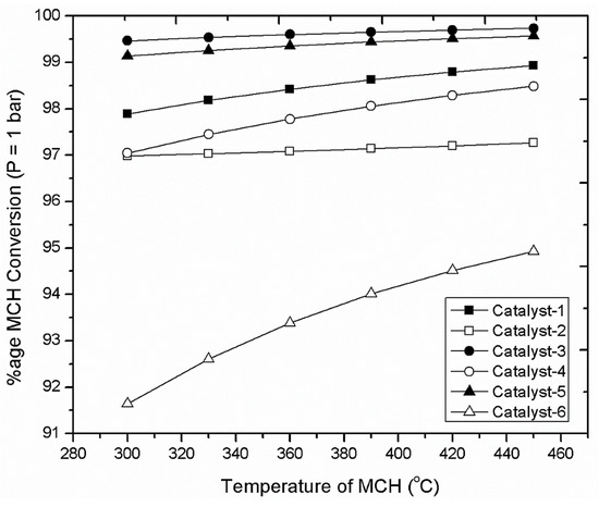 The operating parameters are concurrently altered to determine the percentage of methylcyclohexane (MCH) conversion for all the six catalysts used in the parametric study. The parametric study is done considering two cases: