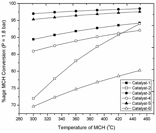 The effect of operational parameters on the methylcyclohexane conversion is presented in Figure 4 for the pressure of 1.8 bar and temperature range of 300–450 °C. The trend is the same as for the operating pressure of 1 bar. However, in the temperature range of 420–450 °C, the percentage of MCH conversion rate for catalyst-2 is better than catalyst-4, and nearly the same as with catalyst-1, i.e., approximately 93% conversion in this temperature range.