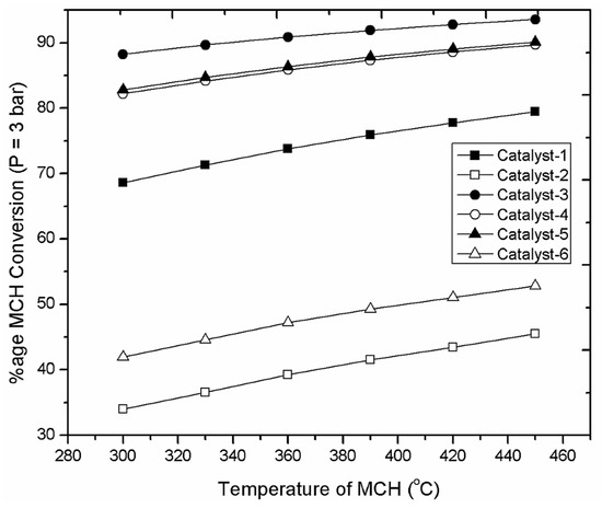 The effect of operational parameters on the methylcyclohexane conversion is presented in Figure 5 for the pressure of 3 bars and temperature range of 300–450 °C. Catalyst-3 gives the highest percentage MCH conversion rate, i.e., a maximum of approximately 92% efficiency at 450 °C. The percentage MCH conversion rates for catalyst-5 and catalyst-4 are comparable at this pressure value and temperature range. However, it remains below 90% even at a temperature of 450 °C. Following these two catalysts, catalyst-1 gives a maximum percentage conversion rate of approximately 78%, catalyst-6 gives a conversion rate of approximately 53%, while catalyst-2 gives the lowest percentage MCH conversion rate, i.e., approximately 44%.