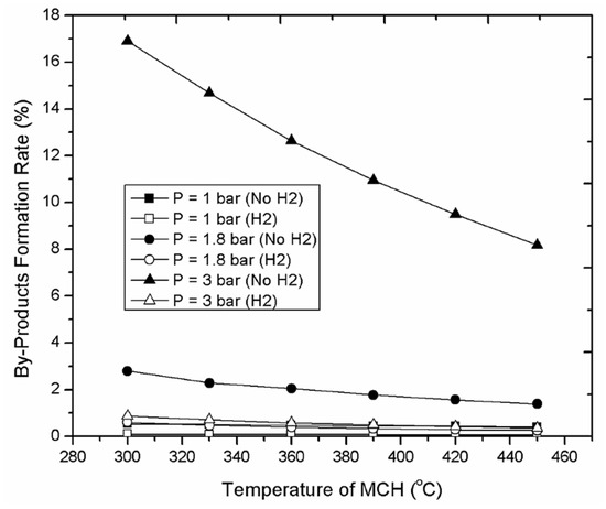 The operating conditions are varied to determine the byproducts formation rate, especially with cyclohexane and benzene. Figure 6 reveals that with the increase in pressure or decrease in temperature of the dehydrogenation reactor feed, the byproducts formation rate increases, while the reverse trend is observed with a decrease in feed pressure of the dehydrogenation reactor, or with an increase in temperature.