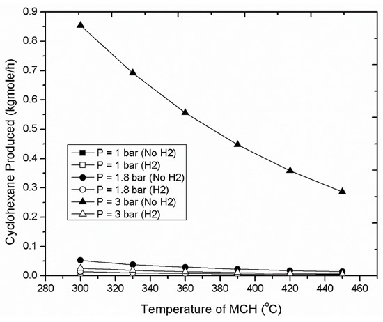 With the decrease in pressure or increase in temperature, the cyclohexane dehydrogenation to benzene increases, therefore, the benzene is the main byproduct at low pressure and high temperature, in accordance with the experimental results of Usman et al. [34]. The trend is presented in Figure 8.