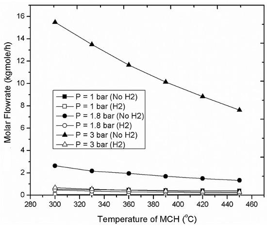 - Concentration of hydrogen in the feed: H2/MCH ratio (by weight) at a value of 0 and 0.5.