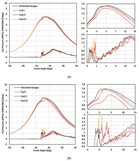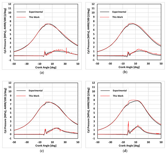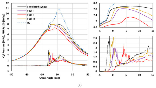 In Figure 2, the cylinder pressure and HRR, in this work and [23] are compared. It indicates the cylinder pressure and HRR over the mentioned range of syngas substitution quantities as well. The absolute errors in the cylinder peak pressure are 0.02, 0.14, 0.11 and 0.20 MPa while errors in the relevant crank angle of those peak points are 3.86, 2.66, 4.09 and 6.72 CA for the cases (a) to (d) respectively.