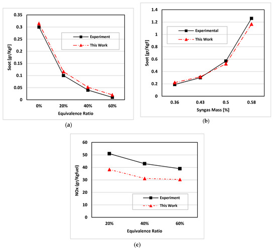 The emission results are also validated with the ones in Ref. [23] as shown in Figure 3. Even though the magnitude of NOX is accompanied with errors more than soot does, this model has the capability to capture the trends in NOX emissions. According to these results, the simulation is quite accurately done and the model may capture the cylinder pressure and HRR of both CDC and diesel-syngas RCCI operations exceptionally well over a wide equivalence ratios and syngas substitution ranges.