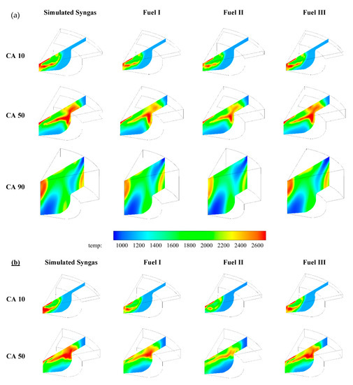 Table 5 displays CA10, CA50, and CA90 of all cases over the syngas quantities sweep. It should be noted that, for a specific premixed ratio, simulated syngas has an earlier combustion phasing than actual ones. Contours in cut planes in Figure 9 illustrates the local temperatures inside the cylinder at CA10, CA50, and CA90 for all three scenarios. According to these contours, fuel II and fuel III have the lowest and the highest temperatures respectively among the actual syngas mixtures. Due to the high flame temperature and burning rate of H2 which results in efficient and complete combustion, the temperature would be somewhat higher in the simulated syngas case. In all scenarios, more homogenous combustion can be detected in compare with CDC.