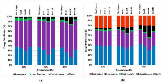 Energy (a) and exergy (b) distributions of the four fuels at various syngas masses.