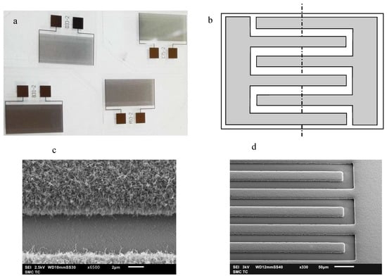 Planar supercapacitors studied in this work: photographs of several samples (a), planar geometry of PMSC (b), SEM images of multiwalled carbon nanotube (MWCNT) array in electrodes for different resolutions (c,d).