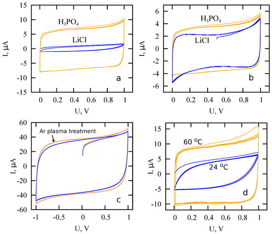 Cyclic voltammograms of planar micro-supercapacitor with solid electrolyte PVA + H3PO4 for scanning rates 50 mV/s (a) and 25 mV/s (b) as well as for the plasma treated sample (c) and curves measured at two different temperatures (d).
