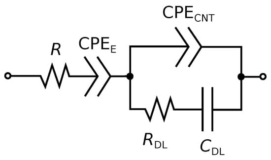 Considering the anomalous diffusion of ions in planar electrodes of PMSC and electrolyte in the interelectrode space, we obtained the following simple equivalent circuit of PMSC (Figure 3). It contains CPEs corresponding to ion subdiffusion in the MWCNT array and, in the interelectrode space, a capacitor  and a resistor  related to the electric double layer capacity and electrolyte resistance. The corresponding impedance is