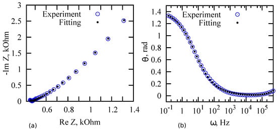 Nyquist plot (a) and frequency dependence of phase shift (b) for PMSC (D33) with PVA + LiCl electrolyte. Circles are experimental data, dots are the result of fitting by impedance Equation (8).