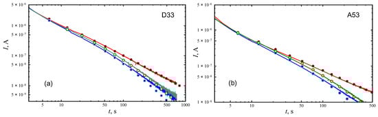 Fitting measured impedance spectra, we determined parameters of equivalent circuit for samples D33 and A53 at room temperature (Table 1). To fit the data, we used the program “EIS Spectrum Analyzer” []. An example of such fitting for D33 sample is shown in Figure 4. The value of parameter  can be explained by the weak influence of ion diffusion in the interelectrode space on the impedance spectrum; therefore, the interelectrode region can be described using a series-connected resistor and an almost “ideal” capacitance. Parameter  is related to ion subdiffusion in MWCNT array. According to Equation (7), value  corresponds to subdiffusion parameter .
