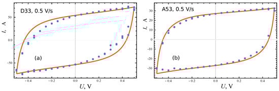 Comparison of measured voltammograms (lines) for PMSC D33 (a) and A53 (b) with the linear responses predicted by the equivalent circuit model with parameters indicated in Table 1 (points).