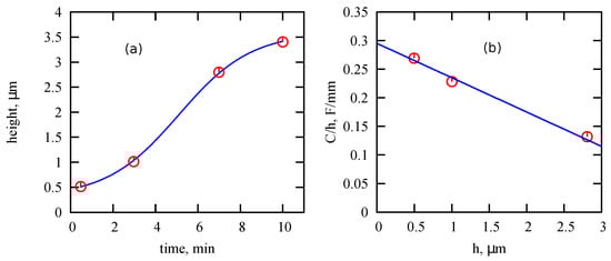Dependence of MWCNT height on duration of array synthesis (a) and the efficiency of using the MWCNT array height for the device capacitance (b). Circles correspond to experimental data, lines are approximation by a cubic polynomial function (a) and a linear function (b).
