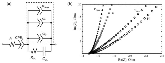 In Figure 8b, Nyquist plots are presented for four cases of subdiffusion index values. Points denoted as  and  corresponds to impedance of the circuit presented in Figure 8 with single -CPE, characterized by  or . Points denoted by V (volume) and H (height) correspond to the similar circuit including impedances described by Equation (10) or Equation (12), respectively. The shapes of these Nyquist plots look similar, but slope strongly depend on the type of distribution of .