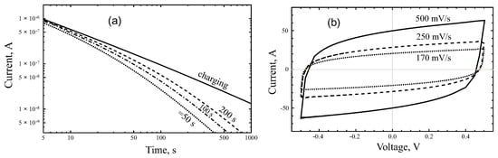 We use the Numerical Laplace Inversion package (Wolfram Mathematica) [] to invert the Laplace transform . Calculated charging and discharging curves, and voltammograms are shown in Figure 5 and Figure 6 and compared with experimental data. There were no fitting parameters, all parameters have been determined from impedance spectra. Thus, we observe quite satisfactory agreement of model responses with experimental data. This means that the PMSC response in potentiostatic and cyclic voltammetry measurements are linear and uniform in time and parameters of equivalent circuit model do not depend on operating voltages.