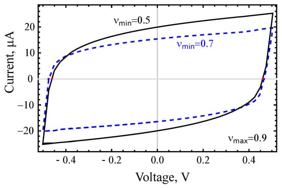 Figure 9 demonstrates charging and discharging curves and voltammograms for the circuit presented in Figure 8 with , . Other parameters are  Ohm,  sβ/Ohm, , ,  μF. Discharging curves indicate the presence of the memory effect, i.e., dependence on the charging prehistory. Cyclic voltammograms of the distributed-order model have the form similar to the single order model. The difference can be seen by variation of . Figure 10 shows two IV-curves for  and . Parameters are the same as for Figure 9 except . Due to effect of disordering, smaller values of  can be related to higher MWCNT array. For increased height of array, the capacity of PMSC grows, but the dependence of C on h is not direct proportionality. The shape of cyclic voltammogram for the same scanning rate is changed. This shape is closer to rectangle for higher values of . This is qualitative explanation of the behavior observed in Figure 7.