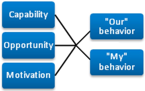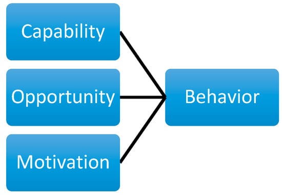 Given the situation where the energy policies and standard operating procedures are already introduced, and energy related technologies are deployed the COM-B model explaining the behavior change factors becomes an effective tool for the further research of military energy behavior. According to the model’s designers Michie et al. [11], three factors heavily influence the behavior: capability (C), opportunity (O), and motivation (M) (Figure 1). The model explores individual’s behavior in the organizational context and provides the basis for managerial interventions [16], as well as includes main steps for behavioral change [17]. According to this model, all three conditions must be met in order to make an influence on individual’s energy behavior: the individual’s physical and social capability, individual’s social and physical ability to explore new opportunities, and self-motivation as the crucial part of the behavior change [18]. This model was theoretically grounded and applied in a wide variety of contexts: nutrition [19], smoking [20], physical activity [21], as well as for energy use by households [22] and other end-users [23]. The COM-B model was applied to improve energy behavior in the military too [14,24]. However, those behavioral interventions in military and defense were purely practical and lacked intrinsic validity. This suggests that the COM-B model should first of all be tested as a solution/construct in the military context.
