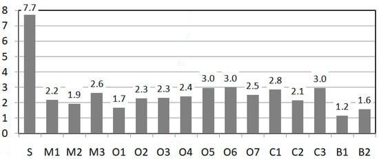 Average values of all answers. “S” denotes overall satisfaction (max 10), “B1”—“my” behavior, “B2”—“our” behavior, other variables are defined in Table 2, and they range from 1 (best) to 5 (worst).