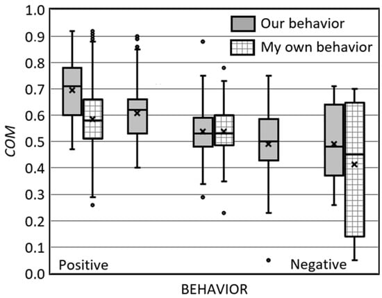 Individually, each of the behavior variables positively correlates with the COM variable—the correlation coefficient is 0.45 for “our” behavior and 0.16 for “my” behavior. This can be observed in Figure 5, where the behavior becomes more positive as the COM variable grows.